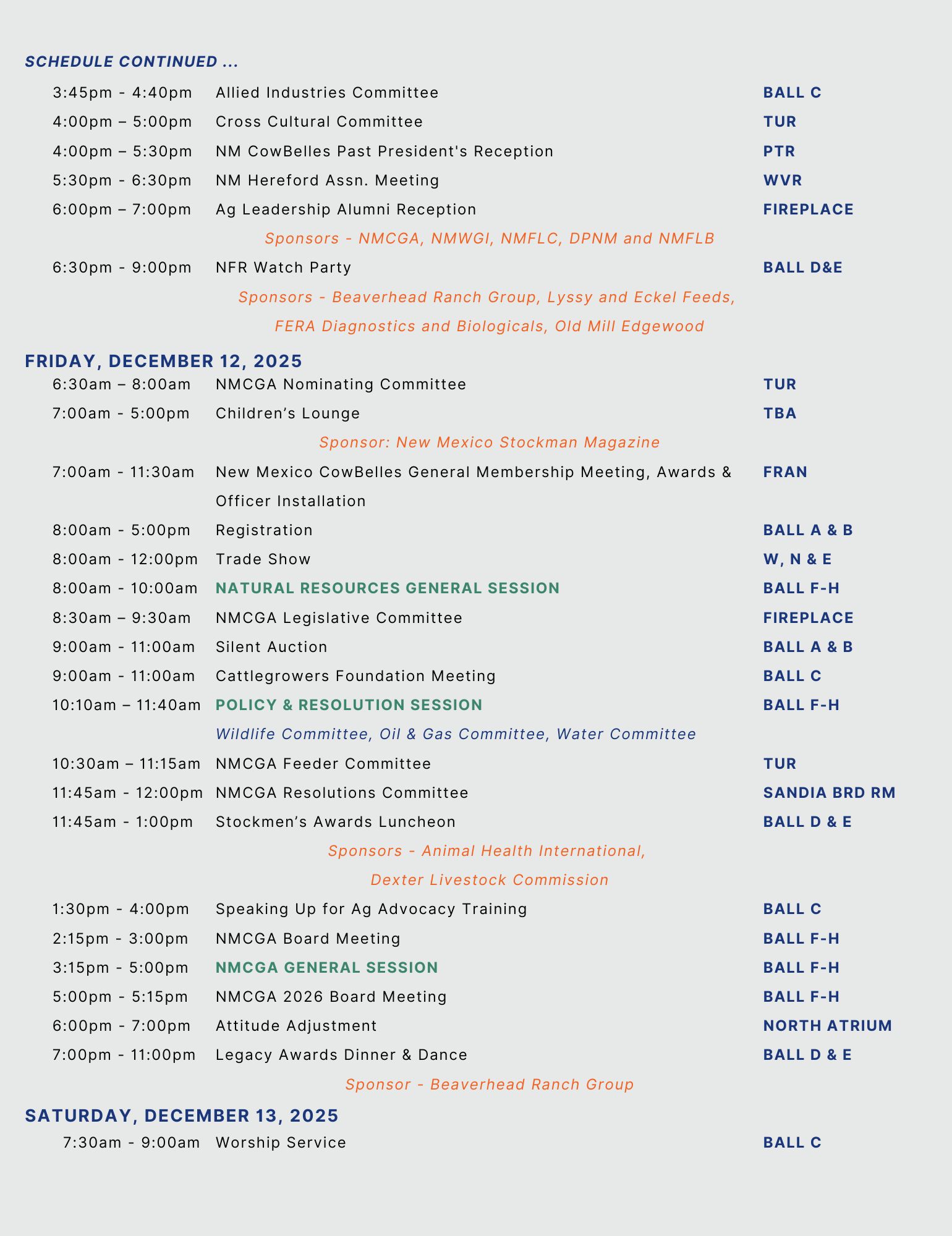 | Trade Show Reception New Mexico Beef Council Cattlemen's College ADM Merck Animal HealthNM Beef Council Purina ZoetisZinpro Legacy Awards DinnerBeaverhead Ranch Group Family LuncheonAmerican AgCredit Stockmen's Award Luncheon Animal Health InternationalDexter Livestock Commission Cattleman of the Year Award American AgCreditCoBank Cowboss Waypath Employee Benefits Allied Industry Mentor Program Agri-PlanAgTrust Farm CreditAmerican AgCreditAnimal Health InternationalRanch-Bot NMCGA Board of Directors Breakfast