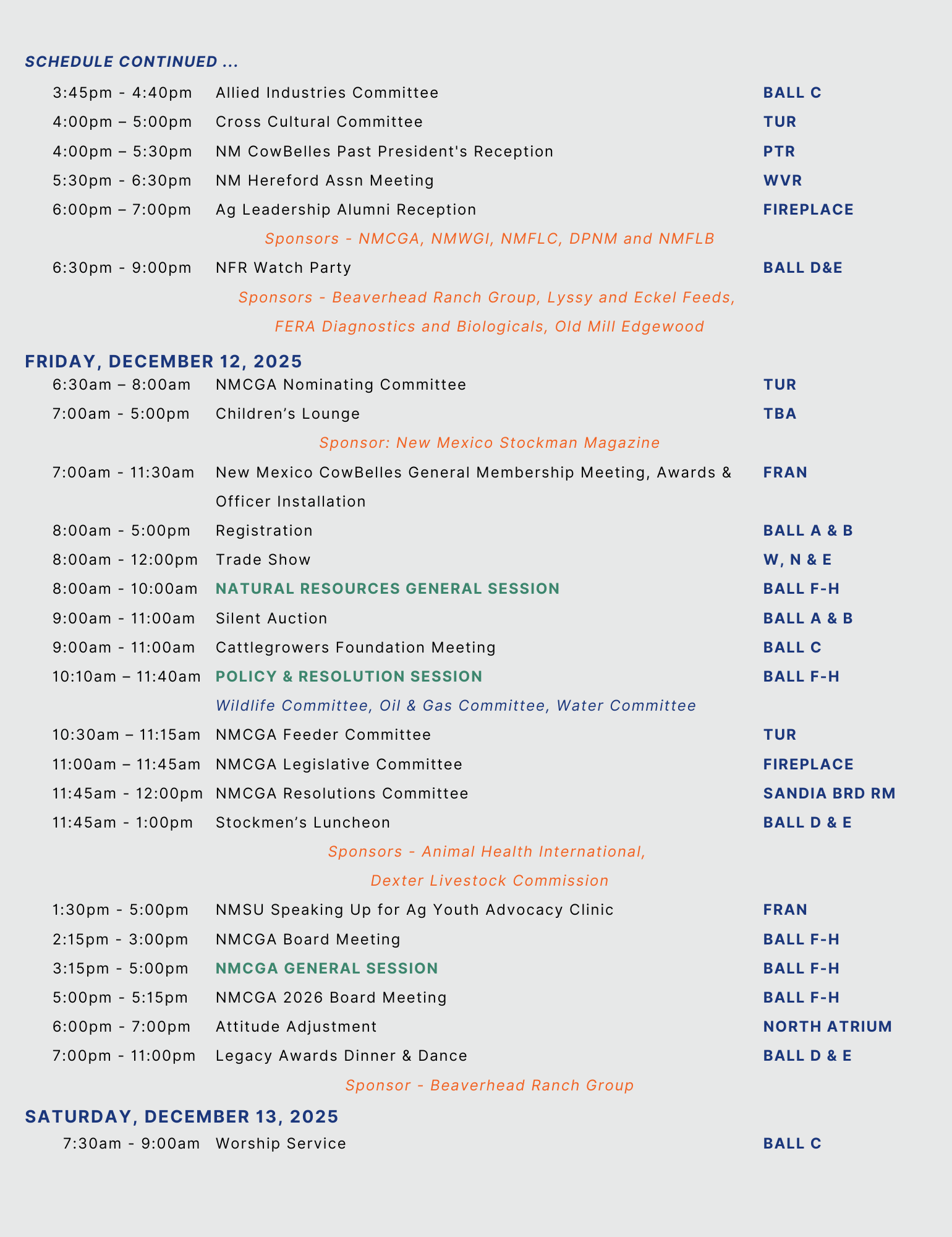 | Trade Show Reception New Mexico Beef Council Cattlemen's College Merck Animal HealthADM Purina ZoetisZinpro Legacy Award DinnerBeaverhead Ranch Group Family LuncheonAmerican AgCredit Stockmen's Award Luncheon Animal Health InternationalDexter Livestock Commission Cattleman of the Year Award American AgCredit Cowboss Waypath Employee Benefits Allied Industry Mentor Program Agri-PlanAgTrust Farm CreditAmerican AgCreditAnimal Health International NMCGA Board of Directors Breakfast